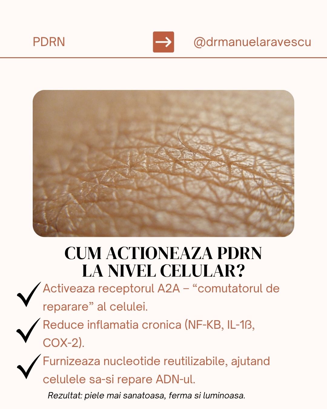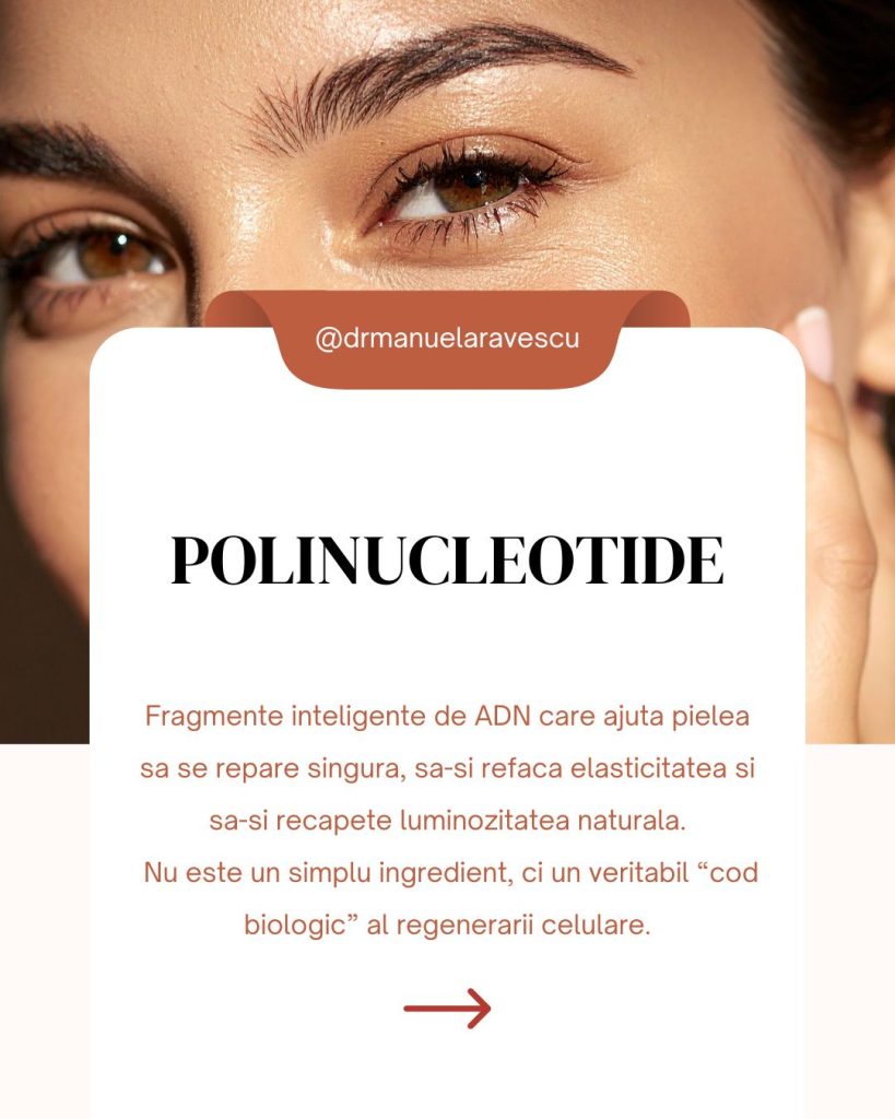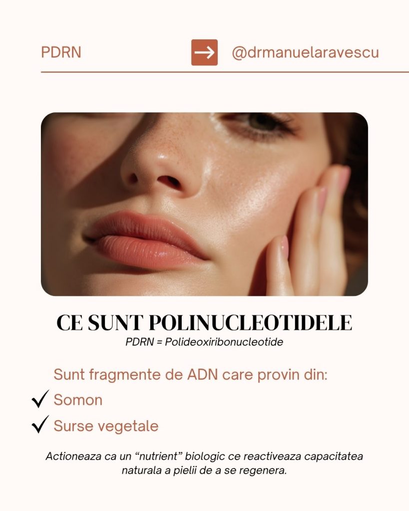Polinucleotidele (sau PDRN – Polideoxiribonucleotide) sunt fragmente de ADN care se pot obtine din surse naturale, cum ar fi somonul sau plantele. Ele functioneaza ca un „combustibil” pentru celulele pielii, ajutand organismul sa isi activeze singur procesele de regenerare.