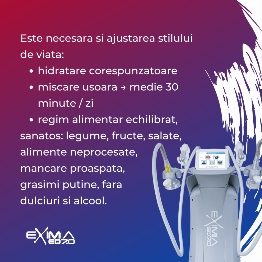 Numarul de sedinte necesar este de 8-10-12, in functie de stadiul celulitei, si marimea rezervelor adipoase. Se fac 2-3 sedinte pe saptamana (ideal 3), pana la obtinerea rezultatului dorit, apoi o sedinta/luna de intretinere. Sedintele de terapie Eximia Med trebuie insotite de: