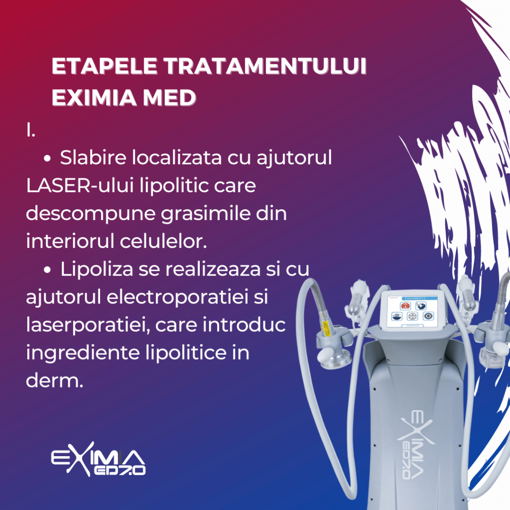 Vibra-laser-electroporatia (VLEP) sau actiunea simultana a radiatiilor LASER, electroporatiei si vibratiilor care realizeaza activarea noninvaziva a tesutului celular subcutanat (grasimea din hipoderm). Tehnologia patentata Eximia Med actioneaza selectiv asupra rezervelor adipoase si a celulitei fara efecte adverse. Rezultatul este scaderea tesutului adipos si accelerarea metabolismului, cu indepartarea rezervelor adipoase locale.