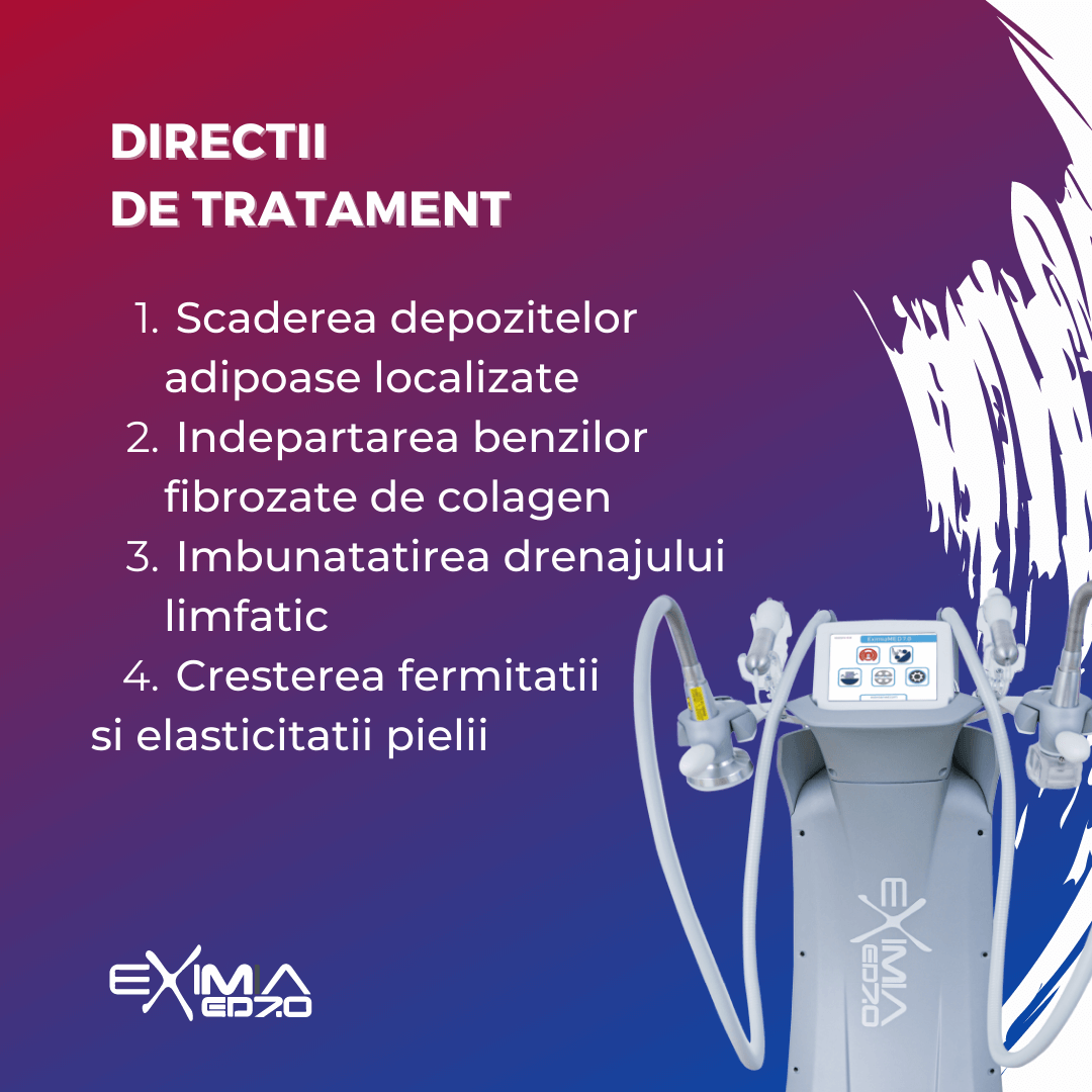 In final, dar nu in ultimul rand, Eximia Med este cel mai performant echipament cunoscut actualmente de inlaturare a rezervelor adipoase localizate care de obicei sunt foarte rezistente la sport si la dieta. Reducerea tesutului adipos nu este doar o chestiune de estetica, ci de imbunatatirea starii de sanatate. Tesutul gras in cantitati care depasesc normalul determina rezistenta la insulina care, in timp, se transforma in diabet zaharat tip 2, hipertensiune arteriala, boli cardiovasculare. Reducerea cantitativa a acestor depozite adipoase va fi cu efect benefic nu doar asupra esteticii, dar si a starii de sanatate pe termen lung.